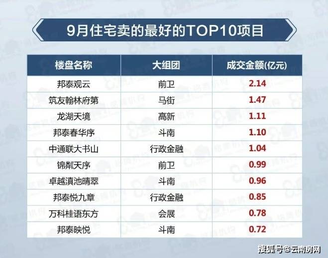 根据铭腾机构发布的9月楼盘销售榜,邦泰观云以领先第二名近7千万的成绩排在榜首,而且销售额前十的楼盘当中,邦泰占据4席, 今年上市的3个新项目全部进入前十,除了第一名邦泰观云,邦泰春华序以1.1亿的销售额排名第四,邦泰映悦销售0.72亿排名第十。 | | 9月住宅卖的最好的TOP10项目 | | | --- | --- | --- | | 楼盘名称 | 大组团 | 成交金额(亿元) | | 邦泰观云 | 前卫 | 2.14 | | 筑友翰林府第 | 马街 | 1.47 | | 龙湖天境 | 高新 | 1.11 | | 邦泰春华序 | 斗南 | 1.10 | | 中通联大书山 | 行政金融 | 1.04 | | 锦粼天序 | 前卫 | 0.99 | | 卓越滇池晴翠 | 酒示 | 0.96 | | 邦泰悦九章 | 行政金融 | 0.85 | | 万科桂语东方 | 会展 | 0.78 | | 邦泰映悦 | 河南 | 0.72 | 9月昆明新房销售TOP10(铭腾机构数 据) 虽然邦泰目前在昆明有6个在售项目,但如果不算位置偏远,价格也比较低的马金铺邦泰花园城,剩余5在售楼盘中有4个杀入月度榜 前十,这是当年鼎盛期的 ...