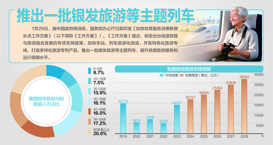 在交通服务方面,《工作方案》指出,制定出台促进铁路与旅游融合发展的专项支持政策,加快车站、 列车旅游化改造,开发特色化旅游专线,打造多样化旅游专列产品,推出一批银发旅游等主题列车,提 升铁路旅游服务和运行保障水平。支持有条件的地方开展邮轮消费创新,提升邮轮服务水平,打造融合 消费场景,开发沉浸式、多元化邮轮消费产品。促进夜游船持续健康发展,推动夜游船提质升级与创新 发展。促进游艇消费高质量发展,修订游艇安全管理规定等相关规章制度,保障游艇业健康发展,加强 公共码头和泊位等游艇基础设施和配套服务保障。依托中国国际消费品博览会等打造游艇展示交易平 台,支持有条件的地方创新推出一批游艇消费场景。优化休闲渔业船舶管理。 北京商报讯(记者 关子辰 牛清妍)1月29日,记者从中国政府网获悉,国务院办公厅日前印发《加快培 育服务消费新增长点工作方案》(以下简称《工作方案》),为优化和扩大服务供给,聚焦重点领域、 潜力领域,加快培育服务消费新增长点。 ...