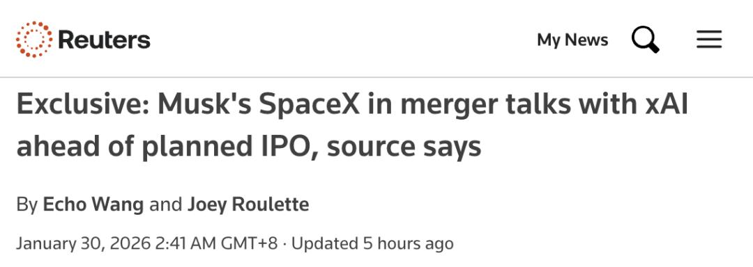 转自: 量子位 | 公众号 QbitAI 为了SpaceX的IPO,马斯克又有大动作! 路透社消息,马斯克 正在推进通过换股的方式,把旗下的SpaceX和xAI合并 。 这一战略整合,正值SpaceX计划于今年晚些时候进行轰动性公开上市的关键前夕。 交易落地后,马斯克的火箭发射能力将与Grok人工智能模型彻底打通,整合在同一个商业屋檐下。 这也是马斯克一贯"商业帝国大一统"策略的延续,此前他已通过类似手段,将社交平台X并入了xAI体系。 SpaceX与xAI换股合并 根据路透社披露的消息,知情人士表示SpaceX与xAI正进行并购谈判,计划通过换股方式合并。 作为交易的一部分,有一些xAI高管也可以选择不要股票,直接拿现金,到目前为止,最终协议尚未签署。 不过这笔交易依然有实质进展——为了促进交易达成, 马斯克已经在内华达州设立了两个实体 。 内华达州企业备案文件显示,这两个名为"K2 Merger Sub"的实体已于21日成立,其中一家有限责任公司将SpaceX及其首席财务官Bret Johnsen列为管理成员,而另一家则将Johnsen列为唯一的高管。 交易敲定后,一个体量惊人的超级商业联合体将随之诞生。 ...