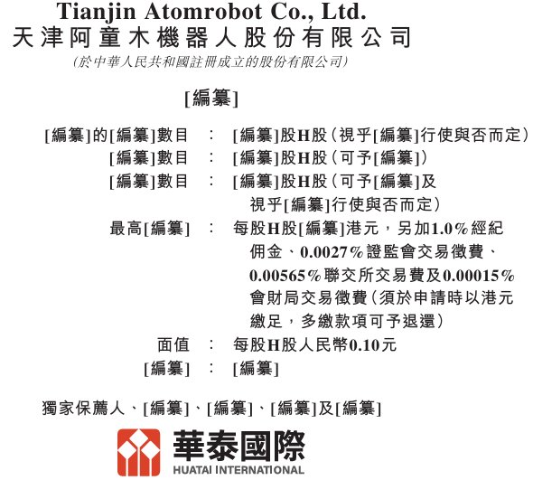据港交所1月28日披露,天津阿童木机器人股份有限公司(简称:阿童木机器人)向港交所主板递交上市申 请书,华泰国际为其独家保荐人。 | 編纂]的[編纂]數目 | :「編纂]股H股(視乎[編纂]行使與否而定) | | --- | --- | | [編纂]數目 .. | [编纂]股H股(可予[編纂]) | | [編纂]數目 | :「編纂]股H股(可予[編纂]及 | | | 視乎[編纂]行使與否而定) | | 最高[編纂] : | 每股H股[編纂]港元,另加1.0%經紀 | | | 佣金、0.0027%證監會交易徵費、 | | | 0.00565%聯交所交易費及0.00015% | | | 會財局交易徵費(須於申請時以港元 | | | 繳足,多繳款項可予退還) | | 面值 : 每股A股人民幣010元 | | 公司简介 据招股书,该公司是一家卓越的高速机器人公司,致力于高速度、高可靠性机器人的研发、生产、销售 与服务,产品矩阵涵盖并联机器人、高速SCARA机器人、重载协作机器人、具身智能机器人四大系列, 并基于丰富的谱系化产品线,为客户提供自动化、智能化的解决方案。该公司聚焦于高速分拣、精密装 配、精准搬运等核心应用 ...