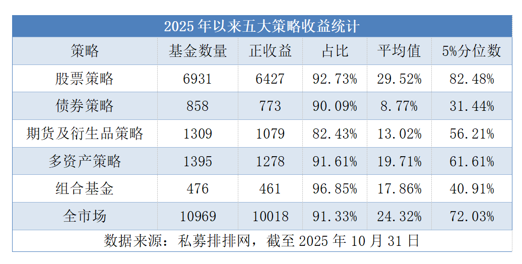 Core Insights - The A-share market has shown a slow upward trend since 2025, with a significant recovery in the bond market and notable performance in stock index futures and precious metals [1] - Private equity funds have performed exceptionally well this year, with 91.33% of products achieving positive returns and an average return rate of 24.32% as of October 31, 2025 [1] Summary by Strategy Type - **Equity Strategy**: Leads with an average return of 29.52% and a positive return rate of 92.73%, with 6,427 out of 6,931 products making profits, benefiting from the structural market rally in A-shares [1] - **Multi-Asset Strategy**: Ranks second with an average return of 19.71% and a positive return rate of 91.61%, effectively capturing equity market gains while diversifying risks through bonds and commodities [1] - **Combination Funds**: Show strong profitability stability with a positive return rate of 96.85%, although the average return of 17.86% is slightly lower than that of multi-asset strategies [1] Bond and Commodity Strategies - **Bond Strategy**: Maintains a steady style with an average return of 8.77%, the lowest among the five strategies, but with a strong positive return rate of 90.09%, reflecting robust risk defense capabilities [2] - **Commodity Strategy**: Faces challenges due to volatile prices in oil and gold, resulting in a relatively modest average return of 13.02% and a positive return rate of 82.43% [2] Quantitative Long Strategy Performance - The quantitative long strategy has excelled with an average return of 36.76% and a positive return rate of 96.52%, significantly outperforming the overall equity strategy [2] - Factors driving this success include adaptability to structural market conditions, high liquidity in the A-share market, volatility benefits, and enhanced data processing through AI technology [3]