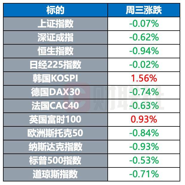 隔夜股市 | 标的 | 周三涨跌 | | --- | --- | | 上证言数 | -0.07% | | 深证成指 | -0.62% | | 恒生指数 | -0.94% | | 日经225指数 | -0.02% | | EFEKOSPI | 1.56% | | 德国DAX30 | -0.74% | | 法国CAC40 | -0.63% | | 项目 下 100 | 0.93% | | 欧洲斯托克50 | -0.84% | | 纳斯达克指数 | -0.93% | | 标普500指数 | -0.53% | | 道琼斯指数 | -0.71% | 全球主要指数周三普遍下跌,美股三大指数集体收跌,纳指跌近1%。 【美国国债总额首次超过38万亿美元】 当地时间10月22日,美国财政部最新公布的数据显示,截至10月21日,美国联邦政府债务规模总额首次 超过了38万亿美元。这距离8月中旬美国联邦政府债务总额达到37万亿美元仅过去两个多月。 【媒体报道称美国允许乌对俄使用远程导弹 特朗普:假新闻!】 当地时间10月22日,美国总统特朗普在社交平台上发文表示,《华尔街日报》关于"美国批准乌克兰使 用西方国家提供的远程导弹打击俄罗 ...