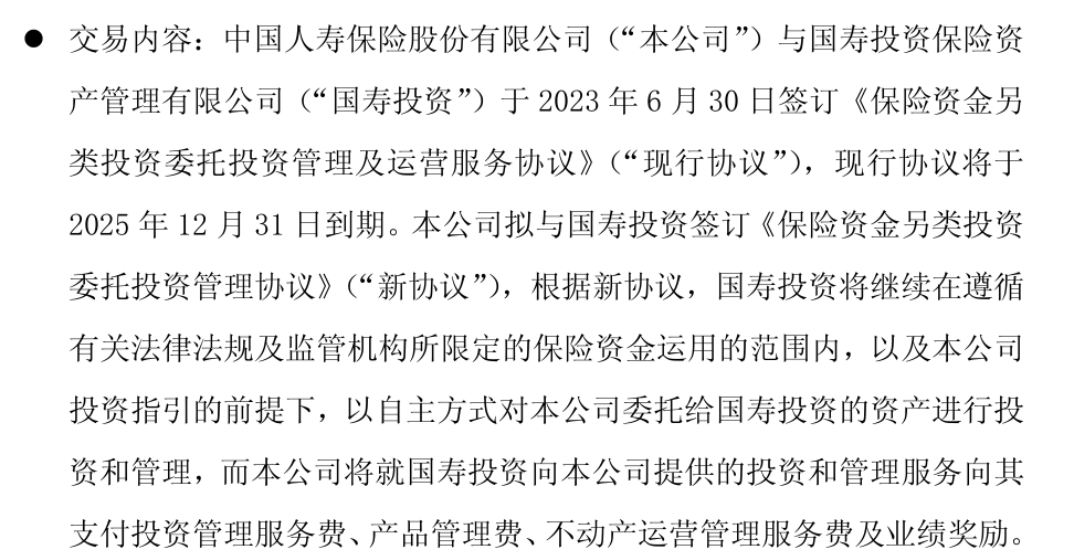 Core Viewpoint - China Life Insurance has announced the renewal of two related transactions with Guoshou Investment Insurance Asset Management Co., which will enhance its alternative investment strategy and strengthen its collaboration with Guoshou Anbao Fund Management Co. [1][3] Group 1: Transaction Details - The first announcement involves the renewal of the alternative investment management cooperation, effective from January 1, 2026, to December 31, 2028, with a maximum signing amount for new entrusted investment management assets set at 120 billion, 140 billion, and 150 billion yuan for the years 2026 to 2028 respectively [1] - The management service fees for new projects will be uniformly calculated at 0.08% annually, with total service fee caps of 1.1 billion, 1.2 billion, and 1.3 billion yuan for the same years [1][2] - The second announcement pertains to the continuation of the business cooperation with Anbao Fund, focusing on fund product subscription, redemption, and private asset management, with annual caps for subscription and redemption amounts set at 2 billion yuan and management fees at 20 million yuan for the years 2026 to 2028 [2] Group 2: Historical Data and Performance - In 2023 and 2024, the newly entrusted asset signing amounts were 76.76 billion and 64.96 billion yuan respectively, with service fees of 770 million and 730 million yuan [2] - For the first half of 2025, the signing amount reached 21.52 billion yuan, with related service fees amounting to 330 million yuan [2] - The historical data for fund subscriptions shows amounts of 140 million yuan in 2023 and 2024, and 175 million yuan in the first half of 2025, while redemptions were 140 million, 350 million, and 70 million yuan respectively [2] Group 3: Company Background - Guoshou Investment, established in 2007, is a specialized alternative investment platform under China Life, with a registered capital of 3.7 billion yuan and a cumulative signing scale exceeding 950 billion yuan as of the end of 2024 [3] - Guoshou Anbao Fund, founded in October 2013, is the first public fund management company in China with insurance background, managing over 340 billion yuan as of June 2025, but facing an asset structure imbalance with over 95% in fixed-income and money market funds [4]