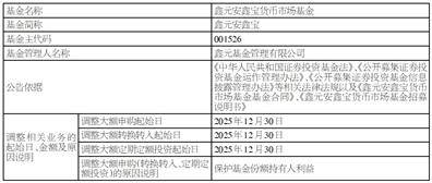 | 高食名房 | | 你元起露宝舒币市场基金 | | --- | --- | --- | | 法会同样 | | 庭元安盛宴 | | 最多主代引 | | 001526 | | 基金管理人名称 | | 废元基金管理有限公司 | | 公告依据 | | 人民共和国正參投资者会注】、《公共 金运作管理办法》、《公开家集汇投投资 | | | | 我露出现小去》等相关法律法规以及《建元安建安货币 | | | | 市场基金基金合同》、《意元安鑫宝货币市场基金招募 | | | | (点图书) | | 日替大脑申影与始日 | | 2025年12月30日 | | 福彩相关业务的 图像人数时预计人类验证 | | 2025年12月30日 | | BIOBI | 起始日,金额及原 调整大额定明定额投资起始日 | 2025年12月30日 | | 四陸大旗中的《转换转入,定期定 | | 保护基金份额持有人利益 | | 糖设备)的原因说 | | | 1公告基本信息 2其他需要提示的事项 1、自2025年12月30日起,鑫元安鑫宝货币市场基金大额申购(转换转入、定期定额投资)业务限额调整 为: 1)单日单个基金账户通过除国联民生证券股份有限公司 ...