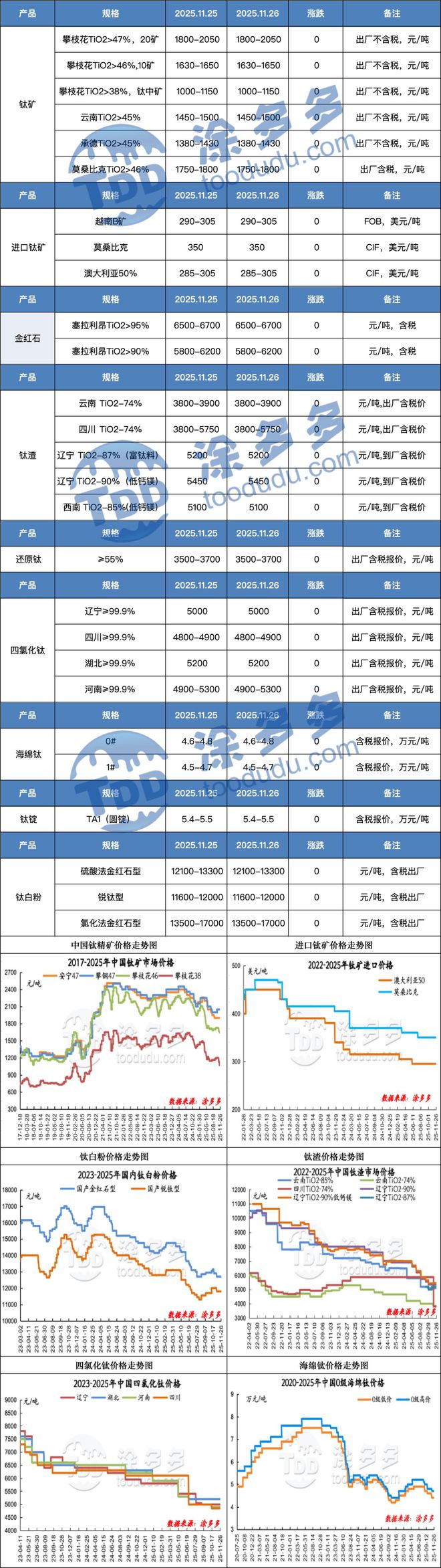 一、钛市场简述 钛矿 今日攀西钛矿价格指数1847.50,较昨日持平。下游市场疲软,矿商也多在观望下游市场本轮涨价情 况。 钛渣 11月北方企业高钛渣招标价格5450元/吨,较10月价格回升10元/吨,高钛渣市场弱势,氯化法钛矿出货 压力大,市场供需双弱。 来源:市场资讯 (来源:钛资讯) 涂多多-钛日刊 | 产品 | 规格 | 2025.11.25 | 2025.11.26 | 涨跌 | 备注 | | --- | --- | --- | --- | --- | --- | | 钛矿 | 攀枝花TiO2>47%,20矿 | 1800-2050 | 1800-2050 | 0 | 出厂不含税,元/吨 | | | 攀枝花TiO2>46%,10矿 | 1630-1650 | 1630-1650 | 0 | 出厂不含税,元/吨 | | | 攀枝花TiO2>38%,钛中矿 | 1000-1150 | 1000-1150 | 0 | 出厂不含税,元/吨 | | | 云南TiO2>45% | 1450-1500 | 1450-1500 | POR | 出厂不含税,元/吨 | | | 承德TiO2>45% | 1380-14 ...