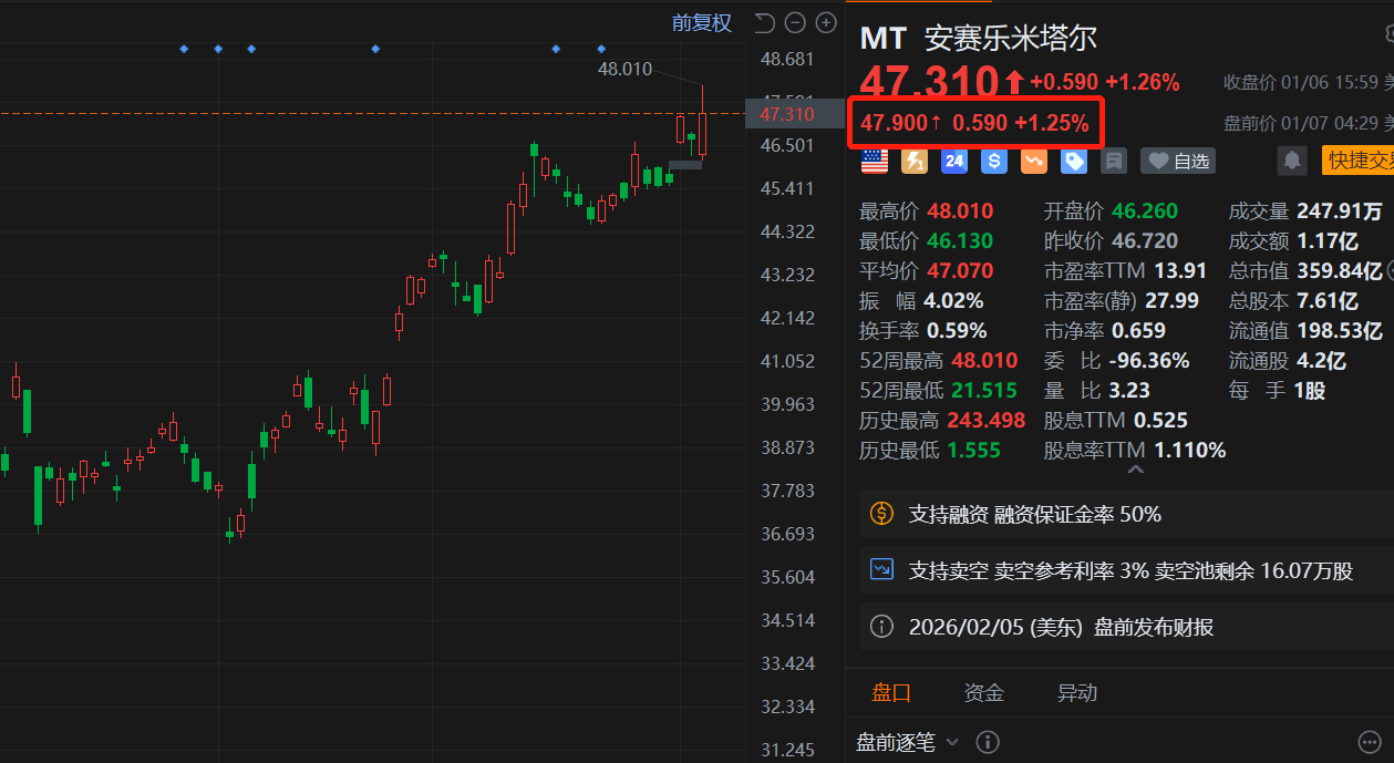 欧洲最大的钢铁集团安赛乐米塔尔(MT.US)盘前续涨1.25%。消息上,罗马尼亚UMB公司将斥资1250万欧元收购了安赛乐米塔尔伦布拉德工厂,近年该公司 持续剥离非核心资产,以压降债务、削减成本并聚焦主业。另外,安赛乐米塔尔与法国电力公司签署了一项关于长期供应低碳、具有竞争力的电力的核电生 产配额合同。 | | 前复权 □ ⊙ ⊙ | | MT 安赛乐米塔尔 | | | --- | --- | --- | --- | --- | | 48.010 | | 48.681 | 47.310 + +0.590 +1.26% | | | | | 47.310 | 47.900↑ 0.590 +1.25% | | | | | 46.501 | 三分 24 S ~ 9 目 | | | | | 45.411 | | | | | | | 最高价 48.010 | 开盘价 46.260 | | | | 44.322 | 最低价 46.130 | 昨收价 46.720 | | | | 43.232 | 平均价 47.070 | 市盈率TM 13.91 | | | | 42.142 | 振 幅 4.02% | 市盈率(静) 27. ...
