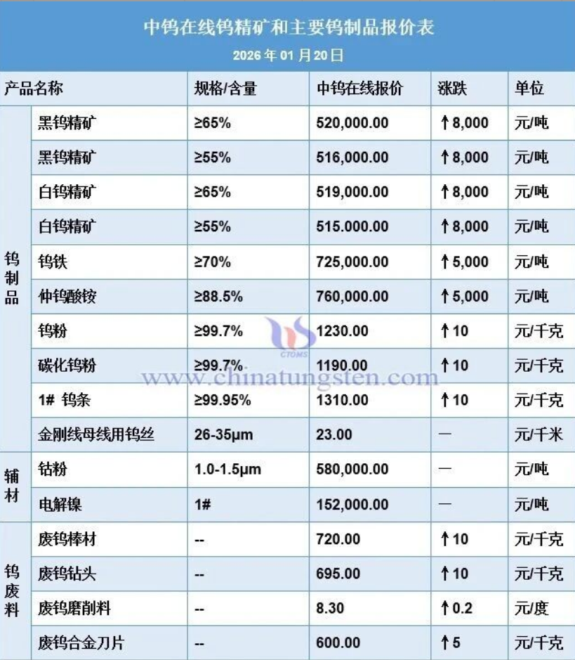 Group 1 - The tungsten market is experiencing tight supply as miners hold back inventory, supporting high prices for tungsten products [1][2] - As of January 20, 2026, the price for black tungsten concentrate (≥65%) is reported at 520,000 CNY per ton, reflecting a 13.0% increase since the beginning of the year [3] - The price for white tungsten concentrate (≥65%) is reported at 519,000 CNY per ton, with a 13.1% increase since the start of the year [4] Group 2 - The price for ammonium paratungstate (APT) in China is reported at 760,000 CNY per ton, up 13.4% year-to-date, while European APT prices range from 987 to 1050 USD per ton (approximately 60.8 to 64.7 million CNY), marking a 10.7% increase [4] - Tungsten powder prices are at 1,230 CNY per kilogram, showing a 13.9% increase since the beginning of the year [4] - The price for tungsten carbide powder is reported at 1,190 CNY per kilogram, with a 14.2% increase year-to-date [5] Group 3 - Tungsten iron prices are reported at 725,000 CNY per ton, reflecting an 11.5% increase since the start of the year [8] - The price for tungsten scrap materials, such as waste tungsten rods and drill bits, has also seen significant increases, with waste tungsten rods priced at 720 CNY per kilogram (up 20.0%) and waste tungsten drill bits at 695 CNY per kilogram (up 19.8%) [10][11] Group 4 - The macroeconomic environment in China is stable, with GDP projected to reach 14,018.79 billion CNY in 2025, growing by 5% [12] - The automotive industry is driving demand for tungsten products, particularly in hard alloy tools and wear parts, although the rise of electric vehicles may reduce tungsten usage in traditional cutting tools [12] - In 2025, China's automotive production and sales are expected to reach 34.53 million and 34.40 million units, respectively, with new energy vehicles accounting for 47.9% of total new car sales [12]