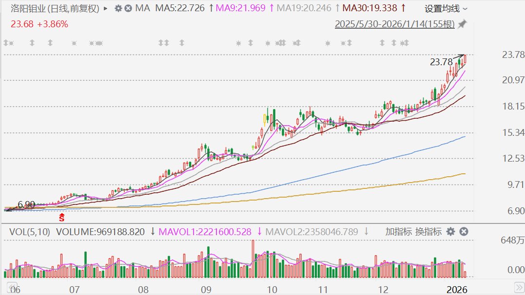 洛阳钼业手握全球约23%钴储量及世界级铜钴矿集群,核心矿山铜钴品位远超行业平均,KFM二期投产后将再增10万吨铜产能,叠加刚果(金)钴出口配额 红利,量价共振支撑业绩高增。洛阳钼业通过资源禀赋优势与数字化改革降本,铜生产成本处在相对低位,"矿山+贸易"模式平滑周期波动,抗风险能力 行业领先。铜钴受益新能源需求扩容,巴西金矿并购落地与厄瓜多尔金矿布局构建"铜金双极",H股股权激励绑定核心团队,长期成长确定性强。 格隆汇1月14日|贵金属价格集体走高,刺激A股市场有色金属股走强。其中,入选了格隆汇2026年"下注中国"十大核心资产名单的洛阳钼业(603993.SH) 盘中涨4.3%报23.78元,再创历史新高。该股在2025年累涨210%后,今年在截至今日的8个交易日内再度累涨超18%。 ...
