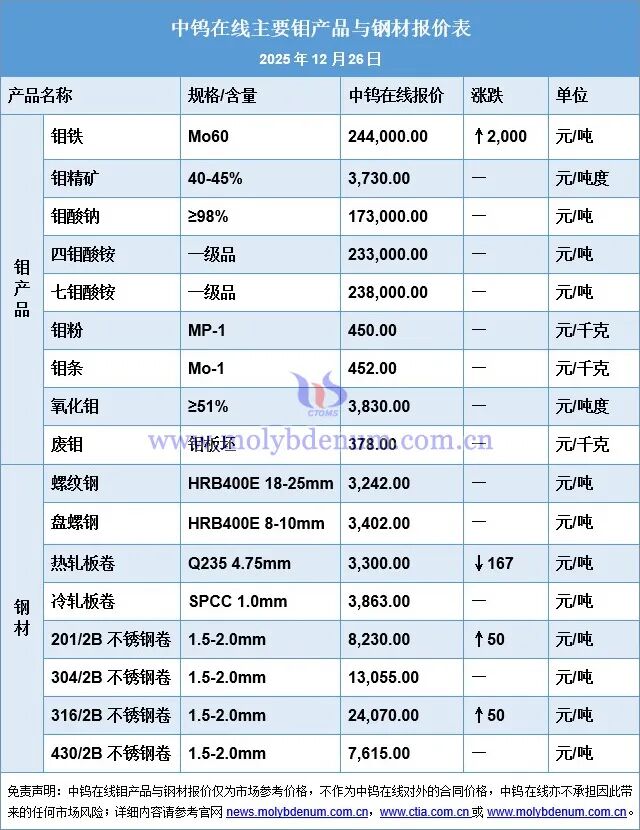 2025年12月26日钼价和钢价一览 | | | 中鸽在线主要钥产品与钢材报价表 | | | | | --- | --- | --- | --- | --- | --- | | | | 2025年12月26日 | | | | | 产品名称 | | 规格/含量 | 中钨在线报价 | 涨跌 | 車位 | | | 領鉄 | Mo60 | 244,000.00 | ↑ 2,000 | 元/吨 | | | 領精矿 | 40-45% | 3,730.00 | r | 元/吨度 | | | 铝酸钠 | ≥98% | 173,000.00 | - | 元/吨 | | 书 | 四钥酸铵 | 级品 | 233,000.00 | - | 元/吨 | | 亡品 | 七辑酸铵 | 级品 | 238,000.00 | - | 元/吨 | | | 領粉 | MP-1 | 450.00 | - | 元/千克 | | | 钼条 | Mo-1 | 452.00 | - | 元/千克 | | | 氧化钼 | ≥51% | 3.830.00 | - | 元/吨度 | | | 废钼 | WWWWW10 VDCen37800 COM | | CH | ...