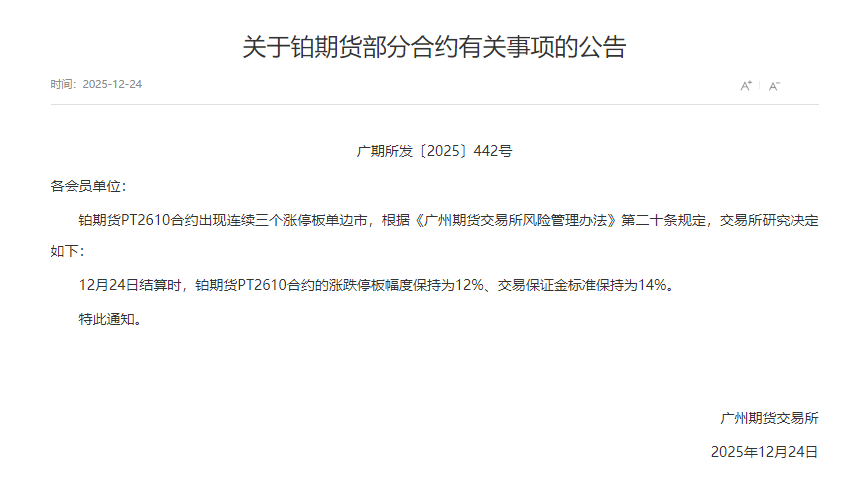 广期所:12月24日结算时,铂期货PT2610合约的涨跌停板幅度保持为12%、交易保证金标准保持为14%