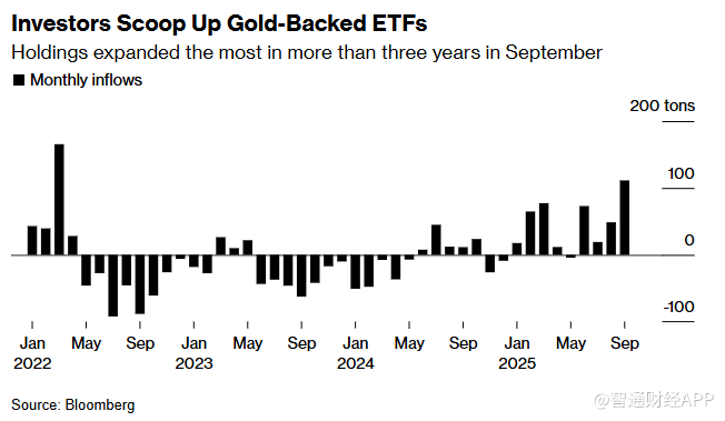 投资者纷纷买入黄金ETF 智通财经APP获悉,随着美国政府开始关门,且私营就业数据疲软,交易员加大对美联储降息的押注, 金价在连续五天上涨并创下新高后趋于稳定。 黄金价格目前接近每盎司3860美元,较周三创下的峰值低约35美元。美国政府关门可能导致美联储无法 获得利率决策所需的关键经济数据。这使得经济学家、交易员和政策制定者更加依赖非政府数据,比如 周三公布的ADP Research报告,该报告显示9月份私营部门就业岗位大幅减少。 原定于周五公布的非农就业数据将因政府关门而推迟,这也有可能加剧美元的压力。交易员们加大押注 美联储今年将再降息两次以支撑疲软的劳动力市场。较低的借贷成本往往会提振无收益的黄金,而当美 元走软时,黄金对大多数买家来说也会变得更便宜。 今年以来,黄金价格已飙升47%,有望创下1979年以来的最大年度涨幅。此次上涨得益于各大央行买入 以及黄金ETF持仓增加,同时美联储也恢复了降息举措。彭博汇编的数据显示,9月份ETF的月度资金 流入量创三年来新高。 在人们对美联储独立性的担忧日益加剧之际,避险需求升温也提振了黄金。周三,美国最高法院拒绝了 美国总统唐纳德·特朗普立即解雇美联储理事丽莎·库 ...