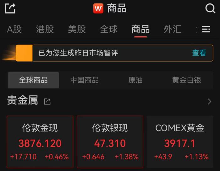 国庆假期首日,金价再创新高。 1日,白银价格也出现上涨。截至发稿,COMEX白银涨近2%,至47.4美元/盎司。业内人士表示,金价 不断创新高,市场在贵金属家族中寻找价格相对黄金更具性价比的品种,投资策略从做多黄金扩散至做 多白银和铂金。 1日,COMEX纽约期金价格盘中一度突破3900美元/盎司关口,涨超1%,再创历史新高。伦敦金现价格 也继续上行,盘中一度涨至3895美元/盎司,逼近3900美元大关。 | L | | | w 商品 | | | Q | | --- | --- | --- | --- | --- | --- | --- | | A股 | 港股 美股 全球 | | 商品 | 外汇 | lil | | | 已为您生成昨日市场智评 | | | | | 查看 | | | 全球商品 | | 中国商品 | 原油 | 黄金白银 | | | | 贵金属 △ | | | | | | | | 伦敦金现 | | 伦敦银现 | | COMEX黄金 | | | | 3876.120 | | 47.310 | | 3917.1 | | | | +17.710 +0.46% | | | +0.646 +1.38% | + ...