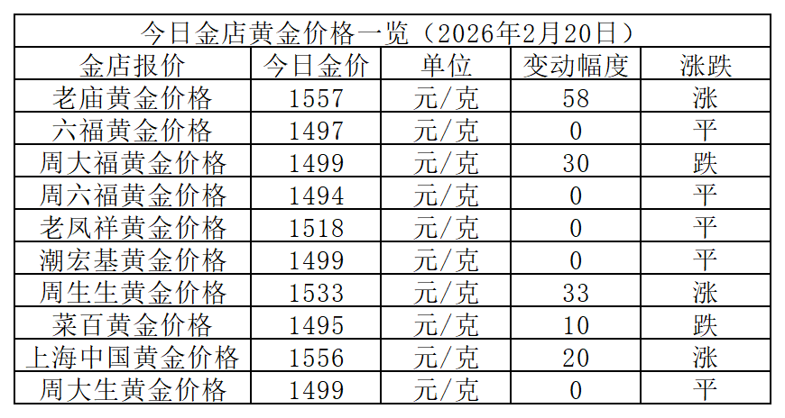 今日国内品牌金店金价多数上扬,部分品牌持平。其中老庙黄金大涨32元/克,领涨市场,为今日最高价金店;周大福、潮 宏基、周大生等品牌均上涨6元/克;老凤祥、周生生、菜百、上海中国黄金价格不变。菜百与上海中国黄金则继续以1538 元/克保持最低价。今日金店高低价差扩大至60元/克,较昨日增加28元。 以下是各大品牌金店详细报价: | | | 今日金店黄金价格一览(2026年2月26日) | | | | --- | --- | --- | --- | --- | | 金店报价 | 今日金价 | 单位 | 变动幅度 | 涨跌 | | 老庙黄金价格 | 1598 | 元/克 | 32 | 派 | | 六福黄金价格 | 1574 | 元/克 | 6 | 涨 | | 周大福黄金价格 | 1576 | 元/克 | 6 | 涨 | | 周六福黄金价格 | 1571 | 元/克 | 6 | 洗 | | 金至尊黄金价格 | 1574 | 元/克 | 6 | 涨 | | 老凤祥黄金价格 | 1566 | 元/克 | 0 | ग | | 潮宏基黄金价格 | 1576 | 元/克 | 6 | 涨 | | 周生生黄金价格 | 1568 | ...