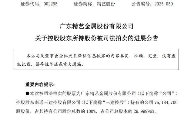 Group 1 - Nantong Sanjian Holdings Co., Ltd. is facing a judicial auction of its shares in Jingyi Co., Ltd. (002295.SZ), with an initial auction price of 725 million yuan for 75.1847 million shares, scheduled for October 9 [2] - The shares represent approximately 29.9996% of Jingyi's total equity, and if successfully auctioned, it will lead to a change in the controlling shareholder and actual controller of the company [2] - The initial auction price is only 60% of the 1.2 billion yuan that Nantong Sanjian paid for the shares in November 2018 [2] Group 2 - Jingyi Co., Ltd. is a leading company in China's copper processing industry, established in 1999, with products widely used in home appliances, automotive, communication, and new energy sectors [3] - The company reported a revenue of 3.754 billion yuan in 2024, a year-on-year increase of 38.43%, and a net profit of 27.7063 million yuan, up 15.57% [3] - The stock price of Jingyi surged from 5.7 yuan per share in January to a peak of 12.49 yuan in July, marking a 120% increase due to demand from the new energy industry [3] Group 3 - Nantong Sanjian was listed among the "Top 500 Chinese Enterprises" in 2018, ranking 157th, and was the second highest revenue-generating private enterprise in Nantong, with annual revenue exceeding 100 billion yuan [3] - The company has faced financial difficulties since the Evergrande crisis in 2022, leading to a series of defaults and being listed as a dishonest entity [4][5] - The shares of Jingyi held by Nantong Sanjian have been frozen by the court, involving multiple cases with a total amount of approximately 1.4 billion yuan [5]