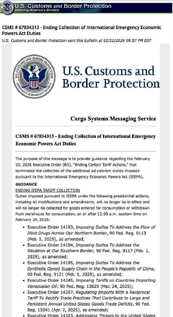 美国海关宣布:取消对等关税与芬太尼税务!2月24日起实施