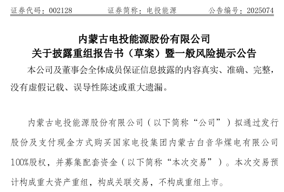 百亿收购。 电投能源(002128)11月14日晚间公告,公司拟通过发行股份及支付现金方式购买国家电投集团内蒙古白音华煤电有限公司100% 股权,同时,公司拟向不超过35名符合条件的特定投资者发行股份募集配套资金,交易价格为111.49亿元(简称"本次交易")。本次 交易预计构成重大资产重组,构成关联交易,不构成重组上市。 11月14日,公司召开了2025年第十三次临时董事会会议,审议通过了《关于〈内蒙古电投能源股份有限公司发行股份及支付现金 购买资产并募集配套资金暨关联交易报告书(草案)〉及其摘要的议案》等与本次交易相关的各项议案。 电投能源表示,本次交易前上市公司主营业务为生产销售煤炭、铝及电力产品等业务。本次交易完成后,上市公司主营业务未发 生变化。本次交易完成后,上市公司的资产规模、营业收入、归属于母公司的净利润等主要财务指标预计将得到提升,进一步提 高了上市公司的业绩水平。 公告称,本次交易尚需提交公司股东会审议及相关法律法规所要求的其他可能涉及的批准或核准,能否取得上述审议通过、批准 或核准及最终取得上述审议通过、批准或核准的时间存在不确定性。公司将根据本次交易的进展情况,严格按照有关法律法规的 ...