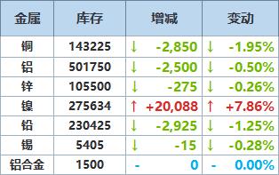 》查看更多金属库存信息 | 地点 | | 前日库存 入库 出库 | | 今日库存 | 变动 | 注册仓单 | 注销仓单 | 注销占比 | | --- | --- | --- | --- | --- | --- | --- | --- | --- | | 铝 | 233350 | 0 | 2925 | 230425 | -2925 | 162500 | 67925 | 29.48% | | 新加坡 | 213175 | 0 | 2000 | 211175 | -2000 | 161925 | 49250 | 23.32% | | 高雄 | 19000 | 0 | તે જેટલ | 18075 | -925 | 100 | 17975 | 99.45% | | 里窝那 | 656 | 0 | 0 | ે જેટર | 0 | 450 | 475 | 51.35% | | 的里雅斯特 | 175 | 0 | 0 | 175 | 0 | 25 | 150 | 85.71% | | 毕尔巴鄂 | 50 | 0 | 0 | 50 | 0 | 0 | 50 | 100.00% | | 巴塞罗纳 | 25 | 0 | 0 ...