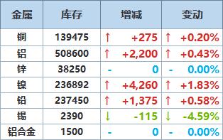 》查看更多金属库存信息 | 金屋 | 阵存 | 増減 变动 | | --- | --- | --- | | 铜 | 139475 | 11 +275 ↑ +0.20% | | 铝 | 508600 | 1 +2,200 1 +0.43% | | 锌 | 38250 | 0 - 0.00% | | 煌 | 236892 | 1 +4,260 1 +1.83% | | 铝 | 237450 | 1 +1.375 ↑ +0.58% | | 锡 | 2390 | - -115 J -4.59% | | 铝合金 | 1500 | 0 - 0.00% | | LME库存 | | --- | | 彩喜 | 廟 | 注册仓单 | 变动 | 注销仓单 | | 变动 | | 汗镜异比 下日异比 | | --- | --- | --- | --- | --- | --- | --- | --- | --- | | 铜 | 139475 | 131050 | -0.02% | 8425 | T | +3.69% | 6.04% | 5.84% | | 品 | 508600 | 403475 | T +1.18% | 105125 | ...