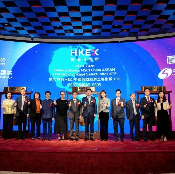 该ETF跟踪MSCI中国东盟经济互联指数,并采用创新的"经济暴露因子"筛选机制,重点投资于在两地市场具有实质业务联动与收入贡献的优质上市公司。产品同时 支持港元、美元及人民币多柜台交易,为投资者提供便捷高效的资产配置工具,分享中国与东盟经济融合发展的长期红利。 首只中国—东盟经济互联ETF登陆港交所 1月28日,银河博时MSCI中国东盟经济互联指数ETF(下简称"银河博时东盟ETF"))举办上市仪式,宣告正式登陆港交所交易。 据悉,"银河博时东盟ETF"跟踪MSCI中国东盟经济互联指数,采用创新编制的"经济暴露因子"筛选机制,聚焦在两地市场具有实质业务联动与收入贡献的优质上市 公司——通过统计"港股通"上市公司在东盟各国的收入占比,及东盟上市公司在中国内地与香港的收入占比,选取排名前50%的优质标的构建投资组合。 产品兼具价值与成长属性,根据MSCI截至2025年末的数据,产品中代表"新质生产力"的可选消费、信息技术、通信的相关股票市值占比近35%、金融相关股票市值 占比近35%,融合了两大市场产业互补优势。在交易设计上,产品同时支持港元、美元、人民币三种货币柜台交易,为全球投资者提供低成本、高便捷度的资产配 ...