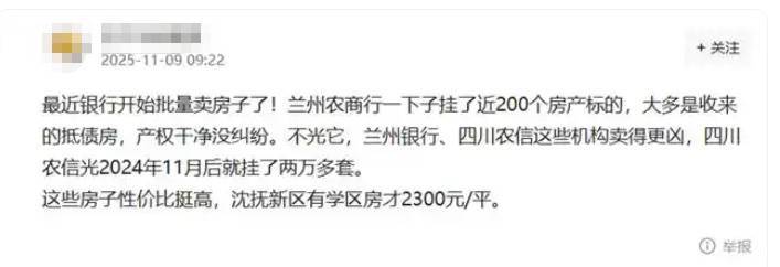 打开京东资产平台,搜索栏自动联想的热词不再是电子产品,而是"银行直供房"。四川农信系统挂牌2.4万套、广东农信1.2万套、辽宁农信1.1万套......这些 冰冷的数字背后,是银行柜台正在演变为中国最大的"线上售楼处"。当金融机构集体变身房产中介,这场史无前例的资产大甩卖,究竟释放出怎样的市场信 号? 银行仓库里的"不动产堰塞湖" 兰州农商行打包出售的471套商业用房,像超市货架上的临期商品般被标注"五折起拍";吉林银行员工的朋友圈里,房产销售海报取代了理财产品广告;广 东某农信社的年度报告中,"抵债资产处置率"首次超越"不良贷款率"成为核心KPI。这些细节拼凑出一个残酷现实:银行手里积压的房产,已从零星抵押物 升级为需要系统性消化的"不良资产包"。 与传统法拍房不同,这批"银行直供房"具有鲜明的时代特征。从区域分布看,新一线城市占比38%成为重灾区,沈阳、成都等地的商业物业占比高达62%; 三四线城市则以住宅为主,但普遍存在配套缺失问题,如海南澄迈某度假房入住率不足10%。更值得关注的是单家银行处置规模——四川农信2.4万套的挂 牌量,相当于中型房企两年的开发量。 断供潮背后的债务链崩塌 辽宁沈抚新区某学区 ...