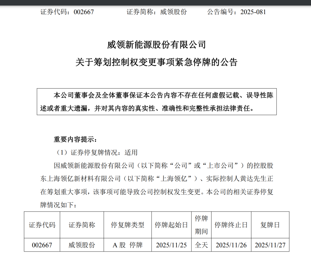 11月24日晚间,威领股份(证券代码:002667)突发公告称,因筹划控制权变更事项,股票将紧急停牌。 | 证券代码 | 证券简称 | 停复牌类型 | 停牌起始日 | 停牌 | 停牌终止日 | 复牌日 | | --- | --- | --- | --- | --- | --- | --- | | | | | | 期间 | | | | 002667 | 威领股份 | A 股 停牌 | 2025/11/25 | 全天 | 2025/11/26 | 2025/11/27 | 威领股份表示,公司控股股东上海领亿新材料有限公司(以下简称上海领亿)、实际控制人黄达正在筹划重大事项,该事项可能导致公司控制权发生变 更。公司股票自11月25日起停牌,预计不超过两个交易日。 值得注意的是,威领股份股价在11月24日高开高走,并在午后突然直线拉升涨停,总市值报44.04亿元。 这意味着,本次股份转让后,上海领亿对威领股份的持股比例将降至5%以下。 据悉,在筹划本次控制权转让之前,上海领亿因被动稀释、主动减持、协议转让、被动减持等原因合计持股比例已大幅下降。 特别是在2022年11月至2024年8月14日期间,上海领亿合计持股比例 ...
