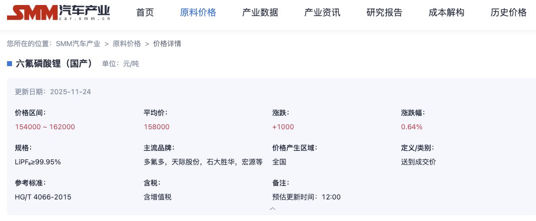 六氟磷酸锂的涨价,也反映在了动力电池产业链相关供应商的股价上:天赐材料、多氟多等"六氟磷酸锂概念股"从今年8月底开始明显上涨,成为二级市 场热议的概念。不过在一周前陆续冲到近期最高点后,天赐材料、多氟多等股票在近几个交易日出现了回调。 相比渲染市场情绪,我们更倾向从产业角度来分析这一轮的六氟磷酸锂涨价。 六氟磷酸锂,这个普通消费者几乎接触不到的化合物,不仅是生产锂电池电解液的重要原材料,还正在创造一场近乎夸张的大涨价。 今年7月,在经历了3年价格回调后,六氟磷酸锂的市场价格开始回升。《证券日报》援引Wind数据显示,六氟磷酸锂价格从7月低点约4.93万元/吨迅速攀 升,至11月17日部分市场报价已突破15万元/吨,短短四个月内涨幅已超200%。据"上海有色网"统计,11月24日六氟磷酸锂的平均价已达到15.8万元/吨。 | SMN= | 首页 原料价格 | 产业数据 | 产业资讯 | 研究报告 | 成本解构 | 历史价格 | | --- | --- | --- | --- | --- | --- | --- | | 您所在的位置: SMM汽车产业 > 原料价格 > 价格详情 | | | | | | | | ■ ...