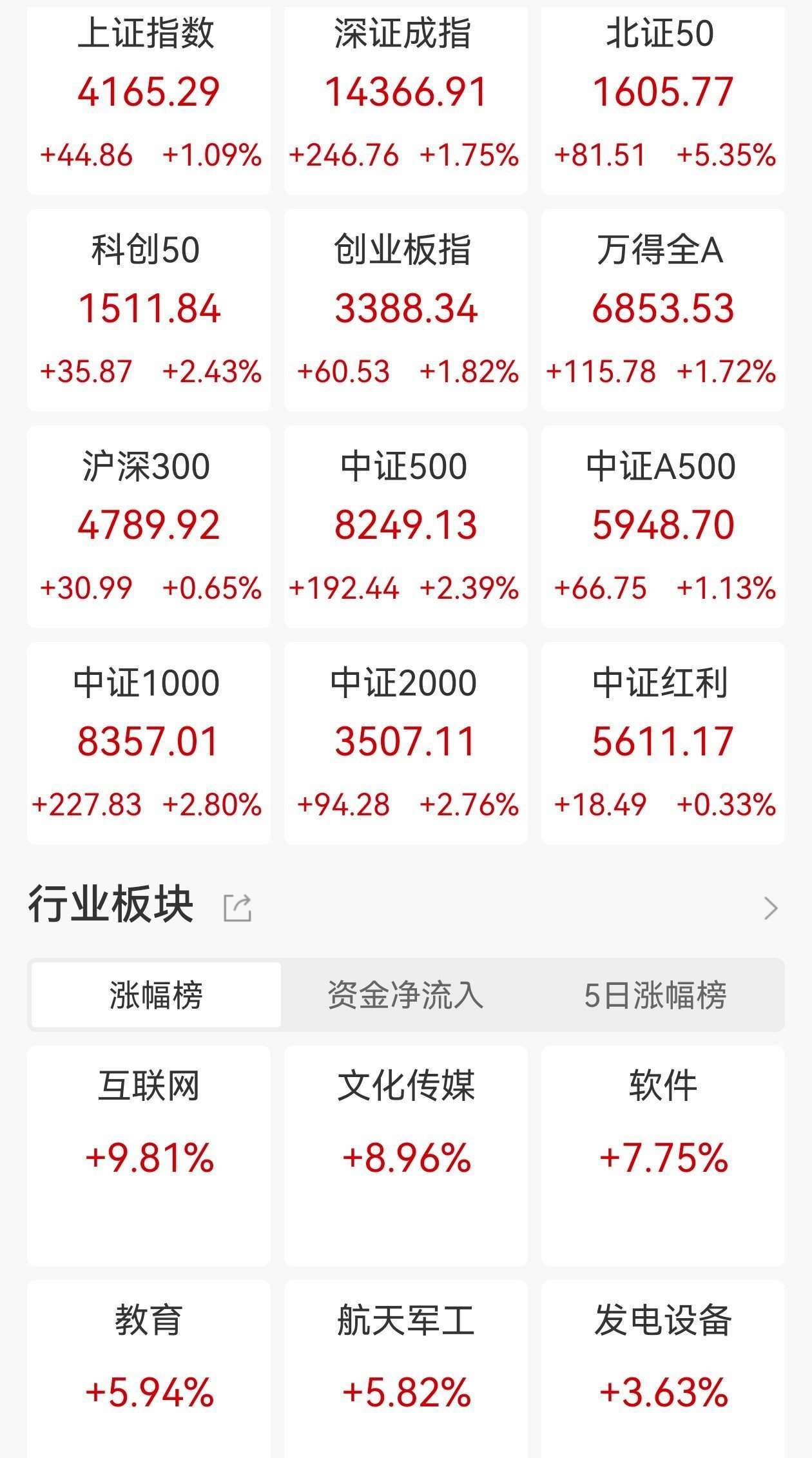 (责任编辑:刘畅 ) 【免责声明】本文仅代表作者本人观点,与和讯网无关。和讯网站对文中陈述、观点判断保持中立,不对所包含内容 的准确性、可靠性或完整性提供任何明示或暗示的保证。请读者仅作参考,并请自行承担全部责任。邮箱: news_center@staff.hexun.com AI应用题材全线爆发,招商基金软件ETF、嘉实基金软件ETF、广发基金传媒ETF和国泰基金影视 ETF涨停。商业航天板块掀涨停潮,华泰柏瑞基金通用航空ETF、富国基金航空ETF、招商基金卫星产 业ETF涨停。 纳指生物科技ETF跌1%。港股红利策略ETF走低,港股通红利ETF易方达、港股通央企红利ETF平 安分别跌1%和0.99%。港股创新药板块飘绿,港股创新药ETF跌0.95%。化工板块走低,化工ETF、化 工行业ETF易方达跌0.9%。新能源板块下下挫,储能电池ETF易方达、锂电池ETF均跌0.8%。 上证指数高开高走十七连阳涨1.09%,报4165.29点,深证成指涨1.75%报14366.91点,创业板指涨 1.82%报3388.34点,北证50涨5.35%报1605.77点。全市场成交额36445亿元,较上日成交额放量4922 ...