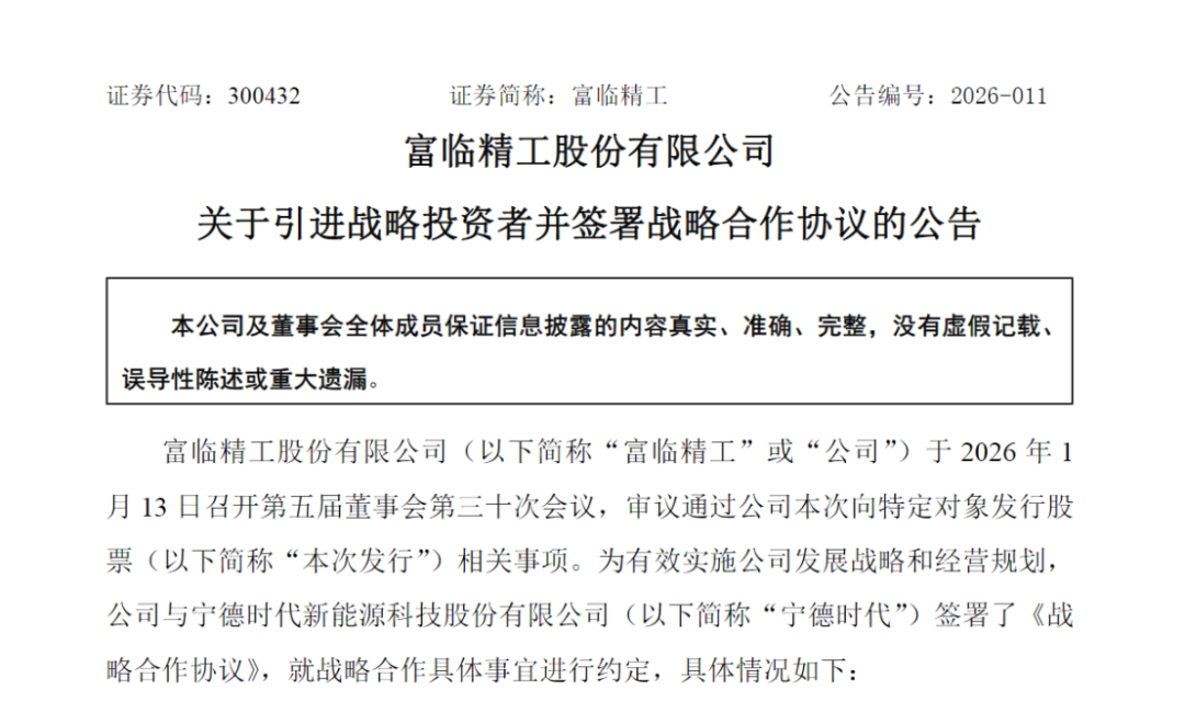 Core Viewpoint - The company Fulin Precision announced the termination of a capital increase and major asset restructuring for its subsidiary Jiangxi Shenghua New Materials, shifting to a comprehensive strategic cooperation with CATL, which is expected to enhance collaboration in lithium iron phosphate materials and other emerging industries [3][4]. Group 1: Fundraising and Projects - Fulin Precision plans to raise a total of 3.175 billion yuan through a private placement, which will be used for projects including an annual production of 500,000 tons of high-end lithium iron phosphate for energy storage, key components for electric drive systems in new energy vehicles, and other advanced technology projects [3]. - After the completion of this issuance, CATL is expected to hold over 5% of Fulin Precision's shares, marking a significant strategic investment [3]. Group 2: Supplier Relationship and Market Demand - Fulin Precision has received multiple large orders from CATL in recent years and has been awarded the Excellent Supplier Award for 2024 and 2025, indicating a strong supplier relationship [3]. - The demand for high-pressure dense lithium iron phosphate products is expected to surge, leading to increased procurement from CATL, which will further integrate Fulin Precision's products into various battery projects [3]. Group 3: Strategic Collaboration and Resource Support - CATL will leverage its advantages to assist Fulin Precision in lithium material precursors, smart electric control for new energy vehicles, energy storage thermal management, and robotics, exploring additional business cooperation opportunities [4]. - A key agreement includes ensuring stable supply of lithium salt for Fulin Precision, which is crucial given the current tight balance in lithium carbonate supply and rising futures prices [4]. Group 4: Emerging Industry Cooperation - Both companies plan to advance cooperation in emerging industries, including the application of Fulin Precision's robotic products in CATL's manufacturing processes [6].