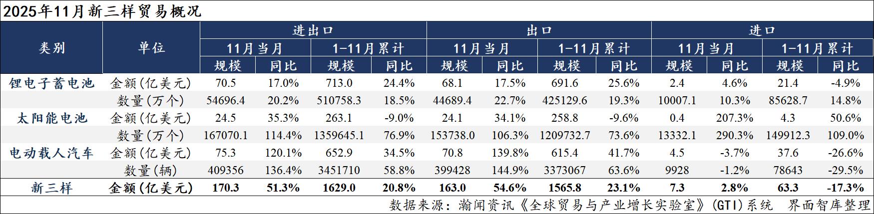 【编者按】为了更全面、更及时、更精确地反映"新三样"产品的出口状况,2025年3月起,智通财经/界面智库和瀚闻资讯联合推出《中国"新三样"出海月 报》。《中国"新三样"出海月报》旨在呈现全国及各省"新三样"产品出口金额、出口数量和出口目的地等指标的月度变化趋势,以期为政府、企业和投资者 等提供决策参考。我们将于每月27日左右发布相关月报。 据界面智库和瀚闻资讯统计,2025年1-11月,我国"新三样"进出口总额1629.0亿美元,同比增长20.8%。其中,出口1565.8亿美元,同比增长23.1%;进口 63.3亿美元,同比下降17.3%。11月当月,我国"新三样"进出口总额170.3亿美元,环比几乎持平于上月,同比增长51.3%、较上月加快19.6个百分点。其中, 出口163.0亿美元,环比下降0.1%,同比增长54.6%、较上月加快22.4个百分点;进口7.3亿美元,环比增长0.5%,同比增长2.8%、较上月下降19.8个百分点。 1-11月,锂离子蓄电池、电动载人汽车、太阳能电池在"新三样"出口中的占比分别为44.2%、39.3%和16.5%,与上年同期相比,锂离子蓄电池、电动载人汽 车占比分别上升了0 ...