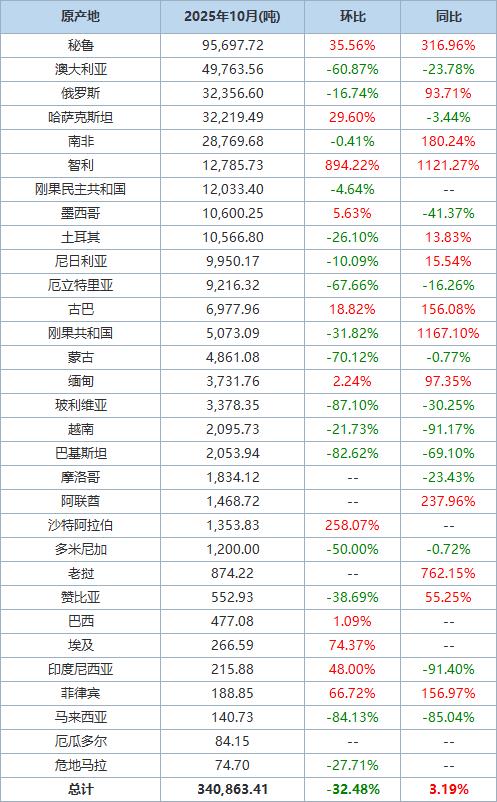 以下为根据中国海关总署官网数据整理的2025年10月锌矿砂及其精矿进口分项数据一览表: 数据来源:海关总署 海关统计数据在线查询平台公布的数据显示,中国2025年10月锌矿砂及其精矿进口量为340,863.41吨, 环比下降32.48%,同比增长3.19%。 秘鲁是第一大进口来源地,当月从秘鲁进口锌矿砂及其精矿95,697.72吨,环比上升35.56%,同比上升 316.96%。 澳大利亚是第二大进口来源地,当月从澳大利亚进口锌矿砂及其精矿49,763.56吨,环比下降60.87%, 同比下降23.78%。 注:进口总量(总计)中亦包括上表未列出的部分原产地数据 ...