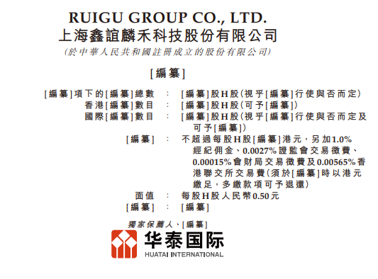 香 港 聯 合 交 易 所 有 限 公 司 及 證 券 及 期 貨 事 務 監 察 委 員 會 對 本 申 請 版 本 的 內 容 概 不 負 責,對 其 準 確 性 或 完 整 性 亦 不 發 表 任 何 聲 明,並 明 確 表 示 概 不 就 因 本 申 請 版 本 全 部 或 任 何 部 分 內 容 而 產生或因依賴該等內容而引致的任何損失承擔任何責任。 上海鑫誼麟禾科技股份有限公司 Ruigu Group Co., Ltd. (於中華人民共和國註冊成立的股份有限公司) 的申請版本 警 告 本申請版本乃根據香港聯合交易所有限公司(「聯交所」)及證券及期貨事務監察委員會(「證監會」) 的要求而刊發,僅用作提供資訊予香港公眾人士。 本申請版本為草擬本,其內所載資訊並不完整,亦可能會作出重大變動。 閣下閱覽本文件, 即代表 閣 下 知 悉、接 納 並 向 上 海 鑫 誼 麟 禾 科 技 股 份 有 限 公 司(「本公司」,連同其附屬公司統 稱 為「本集團」)、本公司的獨家保薦人、整體協調人、顧問及包銷團成員表示同意: 於本公司招股章程根據香港法例第32章公司(清盤及雜項條文)條例送呈香港公司註冊處處長 登記前 ...