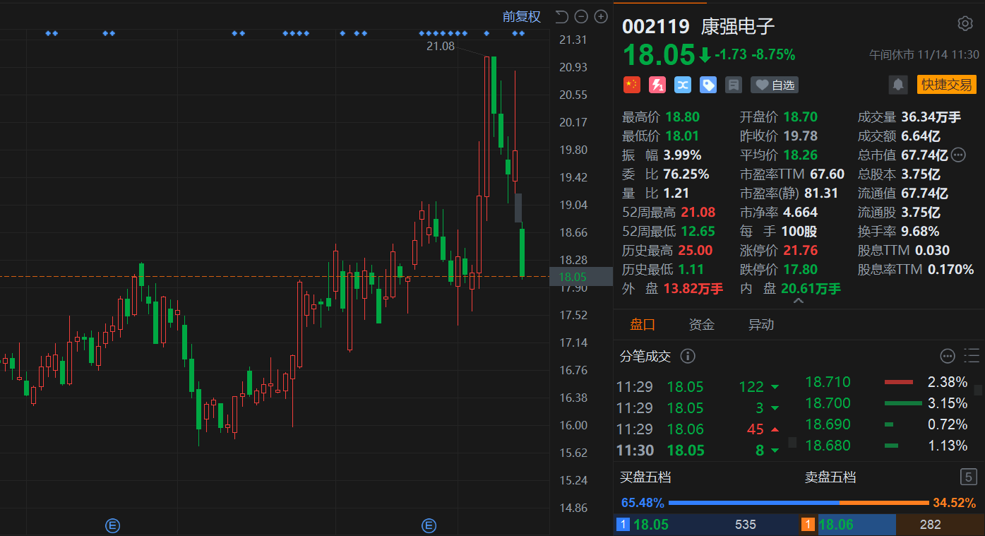 A股异动丨股东拟减持,康强电子午间收跌8.75%,近日连跌抹平此前涨幅