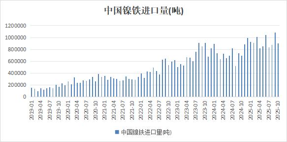 2025年1-10月中国镍铁进口总量925.8万吨,同比增加215.8万吨,增幅30.4%。其中,自印尼进口镍铁量 902.5万吨,同比增加218.6万吨,增幅32.0%。 数据来源:海关总署 据中国海关数据统计,2025年10月中国镍铁进口量90.5万吨,环比减少18万吨,降幅16.6%;同比增加 21.4万吨,增幅31.0%。其中,10月中国自印尼进口镍铁量88.4万吨,环比减少17.1万吨,降幅16.2%; 同比增加21.5万吨,增幅32.1%。中国10月镍铁进口小幅下滑,仍维持高位。 ...