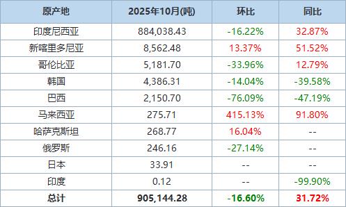 数据来源:海关总署 注:进口/出口总量(总计)中亦包括上表未列出的部分原产地数据 新喀里多尼亚是第二大进口来源地,当月从新喀里多尼亚进口镍铁8,562.48吨,环比增加13.37%,同比 上升51.52%。 以下为根据中国海关总署官网数据整理的2025年10月镍铁进口分项数据一览表: | 原产地 | 2025年10月(吨) | 环比 | 同比 | | --- | --- | --- | --- | | 印度尼西V | 884,038.43 | -16.22% | 32.87% | | 新喀里多尼亚 | 8.562.48 | 13.37% | 51.52% | | 聖伦比亚 | 5.181.70 | -33.96% | 12.79% | | 韓國 | 4.386.31 | -14.04% | -39.58% | | 田 | 2,150.70 | -76.09% | -47.19% | | 三来西亚 | 275.71 | 415.13% | 91.80% | | 哈萨克斯坦 | 268.77 | 16.04% | | | 俄罗斯 | 246.16 | -27.14% | -- | | 日本 | 33.91 | - ...