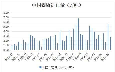 据中国海关数据统计,2025年10月中国镍锍进口量2.83万吨,环比减少2.84万吨,降幅50.06%;同比减 少0.44万吨,降幅13.33%。其中自印度尼西亚进口量为2.79万吨,环比减少49.80%,占本月进口量的 98.45%。2025年1-10月镍锍进口总量35.52万吨,同比减少4.81%。 数据来源:海关总署 ...