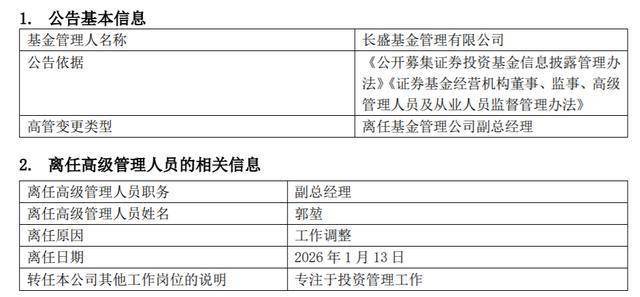 瑞财经 王敏 1月15日,长盛基金管理有限公司(以下简称"长盛基金")发布关于高级管理人员变更公 告,公司副总经理郭堃因"工作调整"离任,未来将"专注于投资管理工作"。 | 基金管理人名称 | 长盛基金管理有限公司 | | --- | --- | | 公告依据 | 《公开募集证券投资基金信息披露管理办 | | | 法》《证券基金经营机构董事、监事、高级 | | | 管理人员及从业人员监督管理办法》 | | 高管变更类型 | 离任基金管理公司副总经理 | 公开简历显示,郭堃曾任阳光资产管理股份有限公司行业研究部新能源和家电行业分析师、制造业研究 组组长。 郭堃自2019年12月加入长盛基金,任多只产品的基金经理,并在2021年7月升任长盛基金副总经理。 数据显示,郭堃管理长盛制造精选混合、长盛匠心研究精选混合、长盛高端装备制造灵活配置混合等7 只主动权益类基金,截至2025年三季度末的管理规模达60.78亿元,占公司主动权益类基金规模的四 成。 其中,郭堃自2020年5月起管理的长盛同盛成长优选(LOF),任职回报达108.98%,为其在管累计收益 率最高的产品。 长盛基金成立于1999年3月26日,董事长为胡 ...