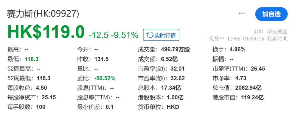 作者 | 张睿 编辑 | 志豪 赛力斯正式登录港交所,股价开盘破发。 车东西11月5日消息,就在刚刚,赛力斯集团股份有限公司(以下简称赛力斯)正式在港交所挂牌上市。 正式交易之前,赛力斯港股股价略有起伏,最终以128.9港元(约合人民币118.20元)开始交易,较131.5港元(约合人民币120.59元)的定价略 有下跌。开始交易后继续下跌,跌幅达9.51%,报价119港元/股(约合人民币109.12元),市值2062.94亿港元(约合人民币1891.72亿元)。 赛力斯港股开始交易后价格 随后,赛力斯股价有所回升,截至发稿前报价123.2港元/股(约合人民币112.97元),市值2135.75亿港元(约合人民币1958.48亿元),开盘破 发。 截至发稿时赛力斯港股股价及市值 总的来看,赛力斯于全球发售了1.08619亿股股份,其中香港公开发售1086.19万股H股,获得132.68倍认购,国际发售9775.71万股H股,获得 8.61倍认购,每股最终定价131.50港元(约合人民币120.59元)。 赛力斯港股招股书 此次赛力斯全球发售最终募资总额为142.83亿港元(约合人民币130.98亿元),扣除发 ...