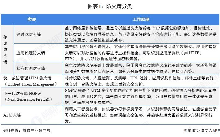 Core Viewpoint - The Chinese firewall market is experiencing rapid growth, driven by the digital transformation of enterprises and increasing network security demands, with the market size expected to reach $2.8 billion by 2024 [15]. Industry Overview - Firewalls are essential network security devices that monitor, filter, and control network traffic based on predefined security policies, serving as the first line of defense against cyber threats [1]. - Firewalls can be categorized into traditional firewalls, Unified Threat Management (UTM) firewalls, Next-Generation Firewalls (NGFW), and AI firewalls, with NGFW integrating multiple security functions for improved performance [1][2]. Industry Chain Analysis - The firewall industry chain consists of upstream hardware components (chips, hard drives, etc.), midstream firewall products, and downstream application sectors including government, finance, telecommunications, and energy [5]. - Key upstream hardware companies include Loongson Technology and Huawei, while midstream product suppliers include Huawei, Sangfor, and Hillstone Networks [5]. Industry Development History - The firewall industry has evolved from simple packet filtering in 1989 to advanced AI firewalls that utilize machine learning for threat detection, addressing complex cyber threats [7]. Policy Background - The Chinese government emphasizes the importance of network security in its "14th Five-Year Plan," establishing a solid policy foundation for the firewall industry [9]. Market Size and Growth - The Chinese firewall market is projected to grow significantly, with a compound annual growth rate (CAGR) of 4.9% from 2025 to 2030, reaching approximately $3.7 billion by 2030 [25]. Competitive Landscape - The firewall industry is concentrated in Beijing and Guangdong, with major players like Qihoo 360 and Sangfor located in these regions, facilitating collaboration and resource sharing [17][21]. - The market features numerous participants, with competition and cooperation occurring simultaneously among various companies [20]. Future Trends and Predictions - The industry is shifting towards intelligent firewalls and adapting to new architectures, with AI and machine learning becoming core upgrade directions [23]. - The market is also seeing a transition from product sales to service-oriented models, such as "Firewall as a Service," which lowers initial costs for small and medium enterprises [24].
