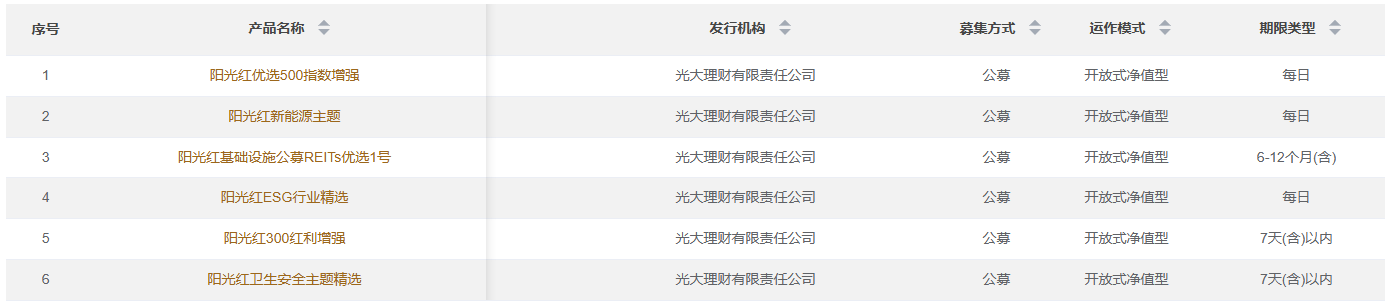中国经济网北京12月11日讯时代周报近日报道《最高募集11亿,光大理财密集"上新"!有权益类产品净值跌幅仍达54%》显示,12月3日,光大理财发布多 个理财产品发行公告,其中产品类型多为固收类,业绩比较基准(年化)在1.60%-3.30%之间。 截至目前,光大理财旗下共有6只权益类产品,从净值表现来看,6只权益产品中,仍有2只产品跌破面值1,分别是阳光红卫生安全主题精选、阳光红新能源 主题。其中,阳光红卫生安全主题精选单位净值跌破0.5,最新净值报0.4523。 中国理财网数据显示,光大理财有限责任公司目前旗下共有6只权益类理财产品,分别为阳光红优选500指数增强、阳光红新能源主题、阳光红基础设施公募 REITs优选1号、阳光红ESG行业精选、阳光红300红利增强、阳光红卫生安全主题精选。 | 序号 | 产品名称 ◆ | 发行机构 ◆ | 嘉集方式 | ऐ | | --- | --- | --- | --- | --- | | | 阳光红优选500指数增强 | 光大理财有限责任公司 | 公募 | ਸ | | 2 | 阳光红新能源主题 | 光大理财有限责任公司 | 公章 | ਸ | | ന | 阳光红基础设施公 ...