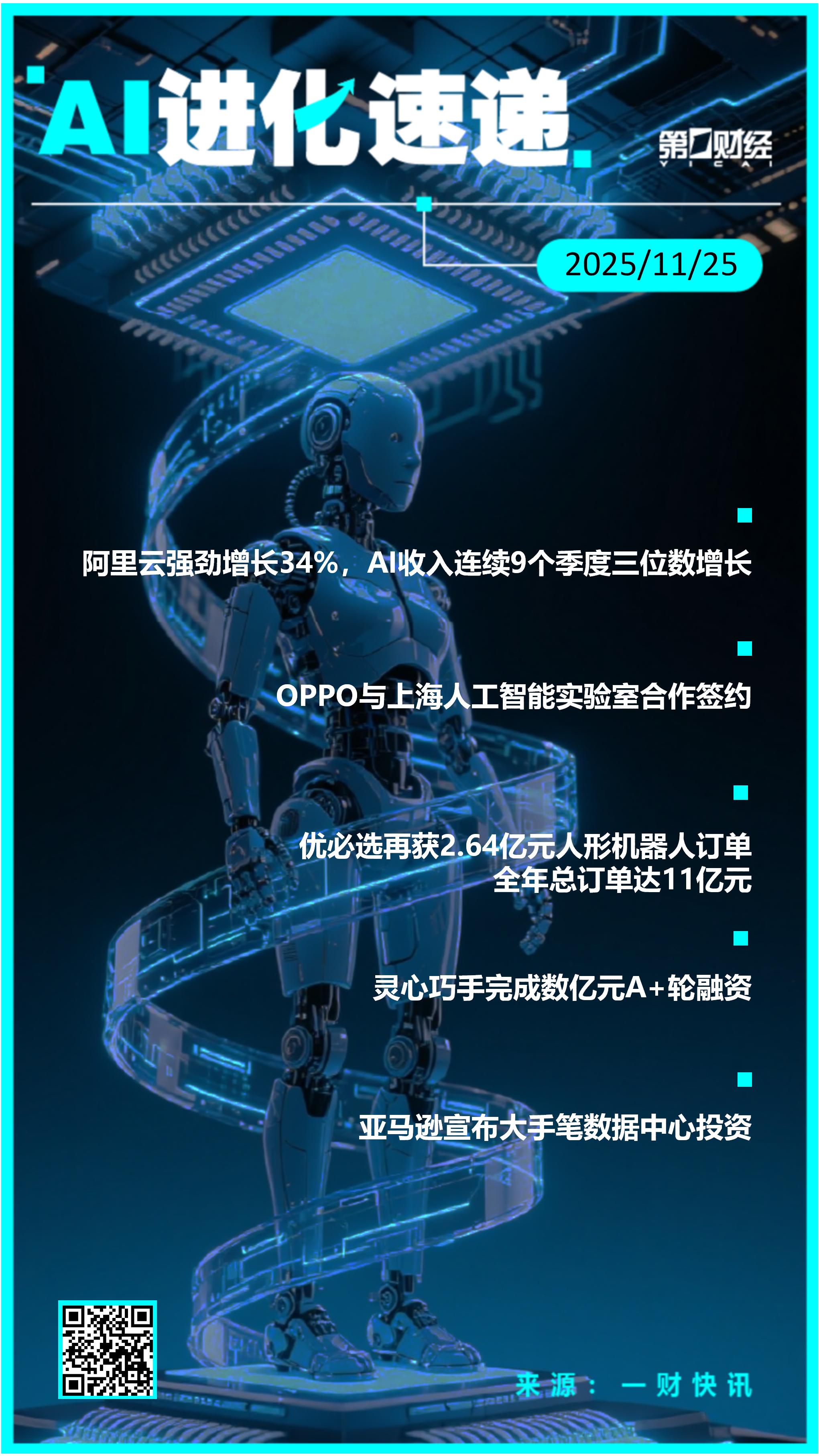 Group 1 - Alibaba Cloud reported a strong growth of 34%, with AI revenue experiencing triple-digit growth for nine consecutive quarters [1][3] - OPPO signed a cooperation agreement with Shanghai Artificial Intelligence Laboratory [1][4] - UBTECH Robotics received an order for humanoid robots worth 264 million yuan, bringing its total orders for the year to 1.1 billion yuan [1][5] Group 2 - Lingxin Qiaoshou completed a financing round of several hundred million yuan in Series A+ [1][6] - Amazon announced a significant investment in data centers [1][7]