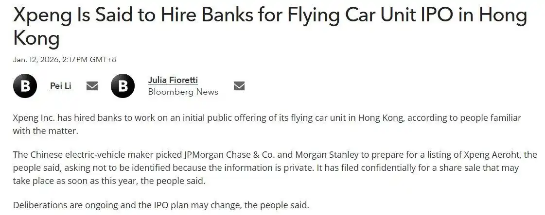 据报道,小鹏汽车生态企业小鹏汇天已向香港联交所秘密递交上市申请,目前已委任摩根大通、摩根士丹利两家投行负责IPO相关事宜,本次上市进程有望 最快于年内完成。 观察者网于1月13日上午就相关情况向小鹏汇天咨询,小鹏汇天方面表示,公司目前专注在产品研发和推进量产交付,暂没有其他IPO相关信息可以分享。 事实上,早在去年,市场便传出多家投行参与小鹏汇天上市辅导工作竞标的消息,彼时该公司的上市地点尚未明确,备选范围包含香港与美国两地。 小鹏汇天官网资料显示,该公司是小鹏汽车的生态企业,致力于为用户打造飞行汽车等低空出行产品。 公司前身汇天最早于2013年在东莞成立,小鹏汽车在2020年对其投资后,小鹏汇天正式成立。2021年10月,公司完成超5亿美元A轮融资,创下当时亚洲低 空载人飞行器领域最大单笔融资纪录。随后的2024年8月,小鹏汇天获得1.5亿美元B1轮融资,投资方为三家广州国资企业。2025年7月15日,公司又完成2.5 亿美元B轮融资。小鹏汽车董事长何小鹏在1月8日的"2026小鹏全球新品发布会"上强调,2026年将实现飞行汽车的量产 。 小鹏汇天的分体式飞行汽车"陆地航母"于2024年首次公开飞行,202 ...