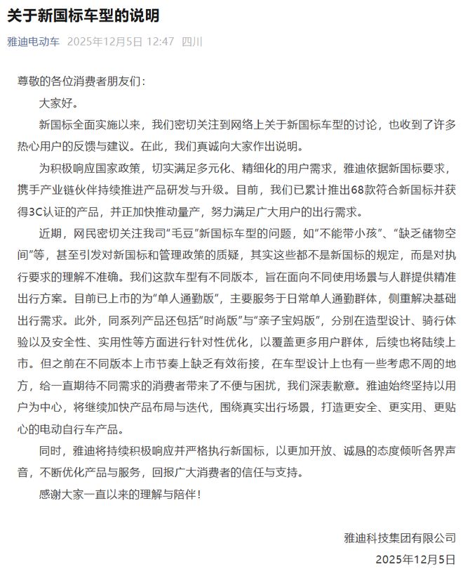 据微信公众号"雅迪电动车"消息,12月5日,雅迪科技集团有限公司发布关于新国标车型的说明: 尊敬的各位消费者朋友们: 大家好。 新国标全面实施以来,我们密切关注到网络上关于新国标车型的讨论,也收到了许多热心用户的反馈与 建议。在此,我们真诚向大家作出说明。 为积极响应国家政策,切实满足多元化、精细化的用户需求,雅迪依据新国标要求,携手产业链伙伴持 续推进产品研发与升级。目前,我们已累计推出68款符合新国标并获得3C认证的产品,并正加快推动 量产,努力满足广大用户的出行需求。 近期,网民密切关注我司"毛豆"新国标车型的问题,如"不能带小孩"、"缺乏储物空间"等,甚至引发对 新国标和管理政策的质疑,其实这些都不是新国标的规定,而是对执行要求的理解不准确。我们这款车 型有不同版本,旨在面向不同使用场景与人群提供精准出行方案。目前已上市的为"单人通勤版",主要 服务于日常单人通勤群体,侧重解决基础出行需求。此外,同系列产品还包括"时尚版"与"亲子宝妈 版",分别在造型设计、骑行体验以及安全性、实用性等方面进行针对性优化,以覆盖更多用户群体, 后续也将陆续上市。但之前在不同版本上市节奏上缺乏有效衔接,在车型设计上也有一 ...