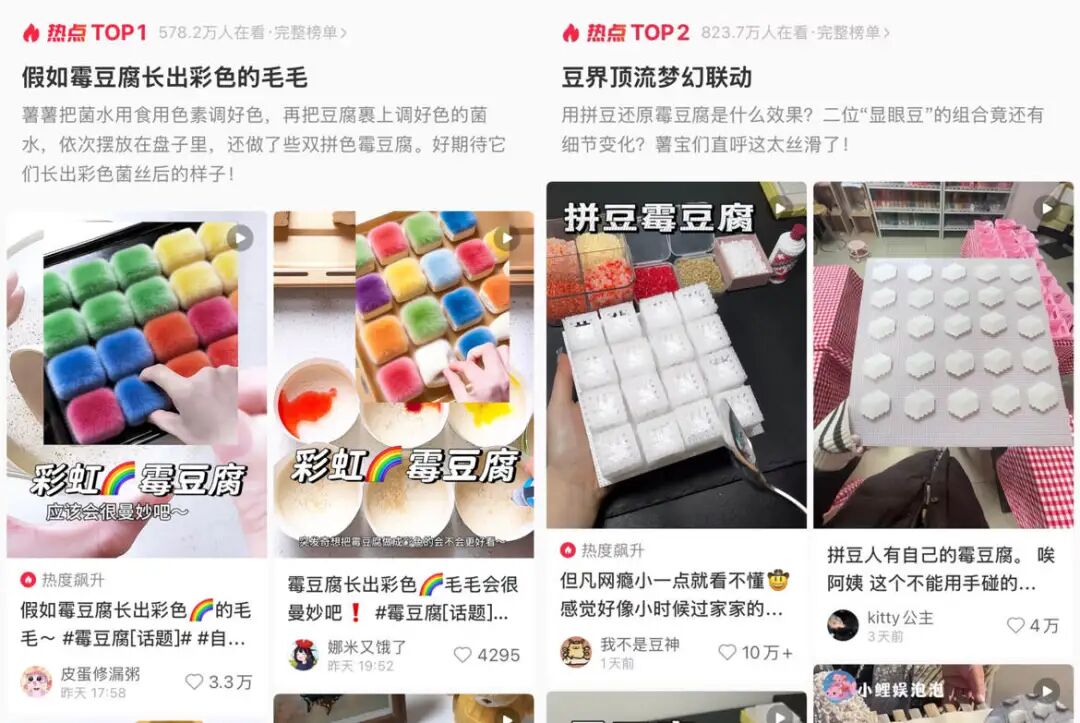 这个冬天,霉豆腐摊主或是短视频里最热门的人设。 一个地道的霉豆腐摊主,标配以下几个灵魂要素。几排雪白绵软的小方块,突然闯入镜头的顾客,以及一段经典台词: "哎这是什么东西啊?"(揪起一块霉豆腐) "哎哎哎!(惋惜咂嘴)不买你别摸啊!这是我要卖的霉豆腐,你搞成这样我怎么卖啊!" "那我买了吧。" "好的,20块一板,QQ弹弹特别香,拿回家放15天就可以吃了。你要微辣、中辣、特辣还是变态辣?" 简言之,就是永远看不住摊位的霉豆腐老板,和一群没边界感但嘴馋的顾客,在短视频里用冲突小剧情来宣传自家的霉豆腐产品。 起初这只是霉豆腐老板为宣传带货拍摄的引流小视频,随橙想,现如今每个网友都想在霉豆腐小视频里演一集。 有人真的去了摊位上,和摊主角色互换。摊主在旁边提词、搭戏,网友自己动手制作霉豆腐,甚至还能还原摊主打包时掉一块的细节: 有人没有霉豆腐,大冷天扛着锅碗瓢盆跑雪地里,用公园长椅做案板、长椅上的积雪做霉豆腐,只为了模拟卖霉豆腐: 有人看什么都像霉豆腐,半夜醒来,对着白花花的摇粒绒被子也是横七竖八一顿划拉: 据新榜编辑部粗略统计,截至目前,#霉豆腐 相关话题的全网视频播放量已超112亿,其中抖音单平台视频播放量达96 ...