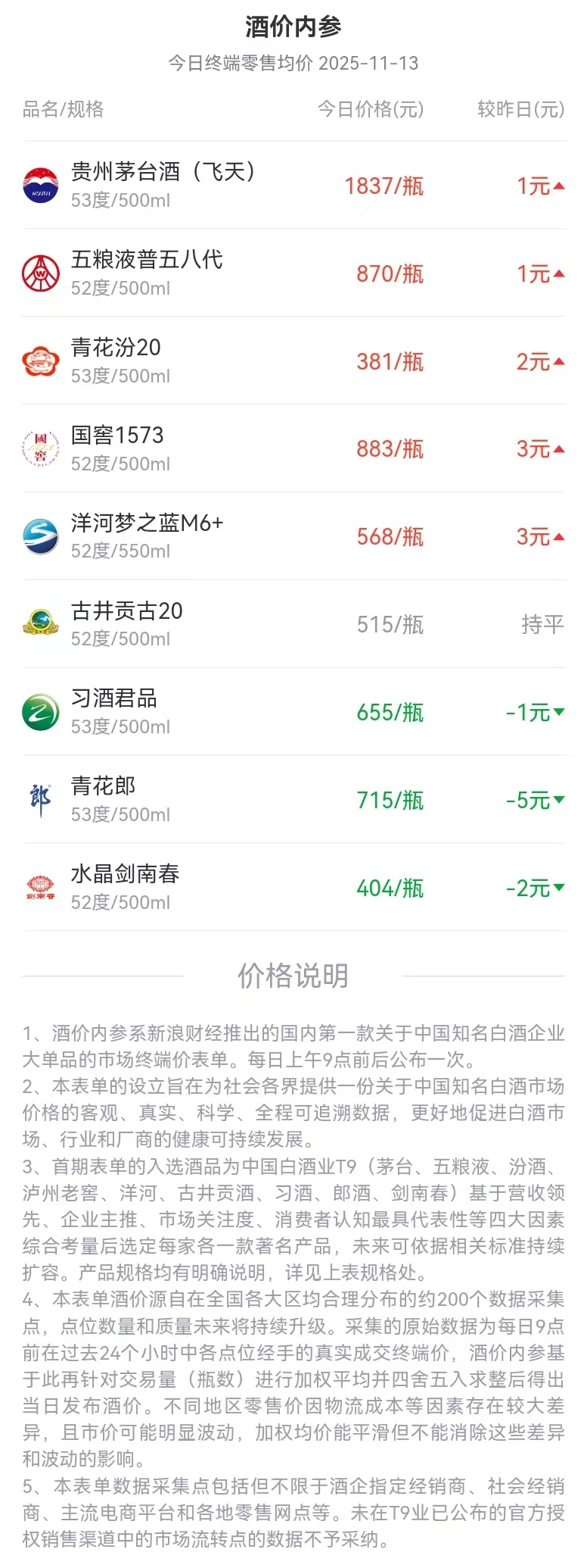 新浪财经"酒价内参"过去24小时收集的数据显示,双十一当天,中国白酒业九强九大单品全国市场的终端零售价格环比整体上扬,贵州茅台飞天的终端零 售均价与昨日相比微涨1元/瓶,近期走势已经显露企稳之势。古井贡古20当日涨幅领先,环比上涨17元/瓶。国窖1573、洋河梦之蓝M6+、习酒君品、青 花郎、水晶剑南春均有数元/瓶不等的涨幅。五粮液普五八代、青花汾20的价格环比小幅下降5元/瓶左右。 - - 水晶剑南春 52度/500ml d Company 406/瓶 2元▲ | 品名/规格 | | 今日价格(元) | 较昨日(元) | | --- | --- | --- | --- | | 53度/500ml | 贵州茅台酒(飞天) | 1836/瓶 | 1元 | | | 五粮液普五八代 | 869/瓶 | -570 | | 52度/500ml | | | | | 青花汾20 | | 379/瓶 | -670 | | 53度/500ml | | | | | 国暦1573 | | 880/瓶 | 2元 | | 52度/500ml | | | | | | 洋河梦之蓝M6+ | 565/瓶 | | | 52度/550ml | ...