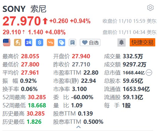 | SONY 索尼 | | | | --- | --- | --- | | 27.970 + +0.260 +0.94% | | 收盘价 11/10 15:59 美东 | | 29.110 ↑ 1.140 +4.08% | | 盘前价 11/11 04:34 美东 | | 二 24 8 24 8 8 8 8 0 0 0 0 0 0 0 0 0 0 0 0 0 0 0 0 0 0 0 0 0 0 0 0 0 0 0 0 0 0 0 0 0 1 | | ● 快捷交易 | | 最高价 28.055 | 开盘价 27.940 | 成交量 332.5万 | | 最低价 27.800 | 昨收价 27.710 | 成交额 9297.2万 | | 平均价 27.961 | | 市盈率 [ M 22.80 总市值 1668.44亿 ( ... ) | | 振 幅 0.92% | 市盈率(静) 22.94 | 总股本 59.65亿 | | 换手率 0.06% | 市净率 3.100 | 流通值 1653.94亿 | | 52周最高 30.285 | 委 比 -60.00% | 流通股 59.13亿 | | 52周最低 18.6 ...