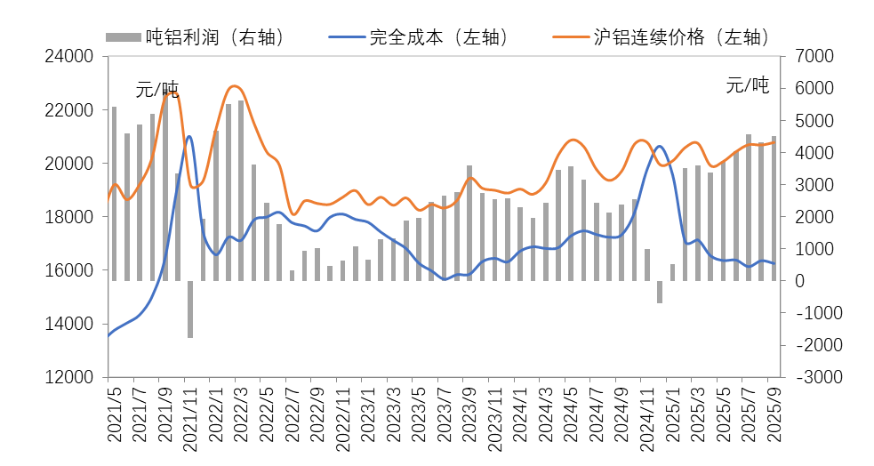 从电价来看,煤炭价格反弹推高了铝企用电成本,当月电解铝行业综合含税用电价格为0.388元/千瓦时,环比上涨0.006元/千瓦时。 从阳极 价格来看,受原料成本增加以及出口需求良好等因素拉动,9月份预焙阳极价格触底回升,月均价回归5000元/吨以上。 在成本下降的同时,电解铝价格小幅上涨,利润上行。9月份沪铝连续合约均价达到20789元/吨,环比上涨99元/吨。测算当月平均利润为 4527元/吨(由于各地区企业所得税税率不同,故没有剔除增值税和所得税),环比增加202元/吨,销售利润率达到21.8%,维持全行业盈利。 智通财经APP获悉,安泰科发文称,2025年9月中国电解铝行业呈现"成本下降,利润增长"的态势。根据安泰科测算,当月电解铝加权平均 完全成本(含税)为16262元/吨,环比下降103元/吨或0.6%;同比下降1080元/吨或6.2%。尽管本月电力、阳极成本均有不同程度上涨,但氧化 铝价格下跌带来的成本减量更显著,推动总成本呈现下降态势。安泰科氧化铝现货报价显示,9月份原材料采购期内,氧化铝现货平均价格 为3138元/吨,环比下跌134元/吨或4.1%。 图 中国电解铝成本与利润 数据来源:安泰科 ...