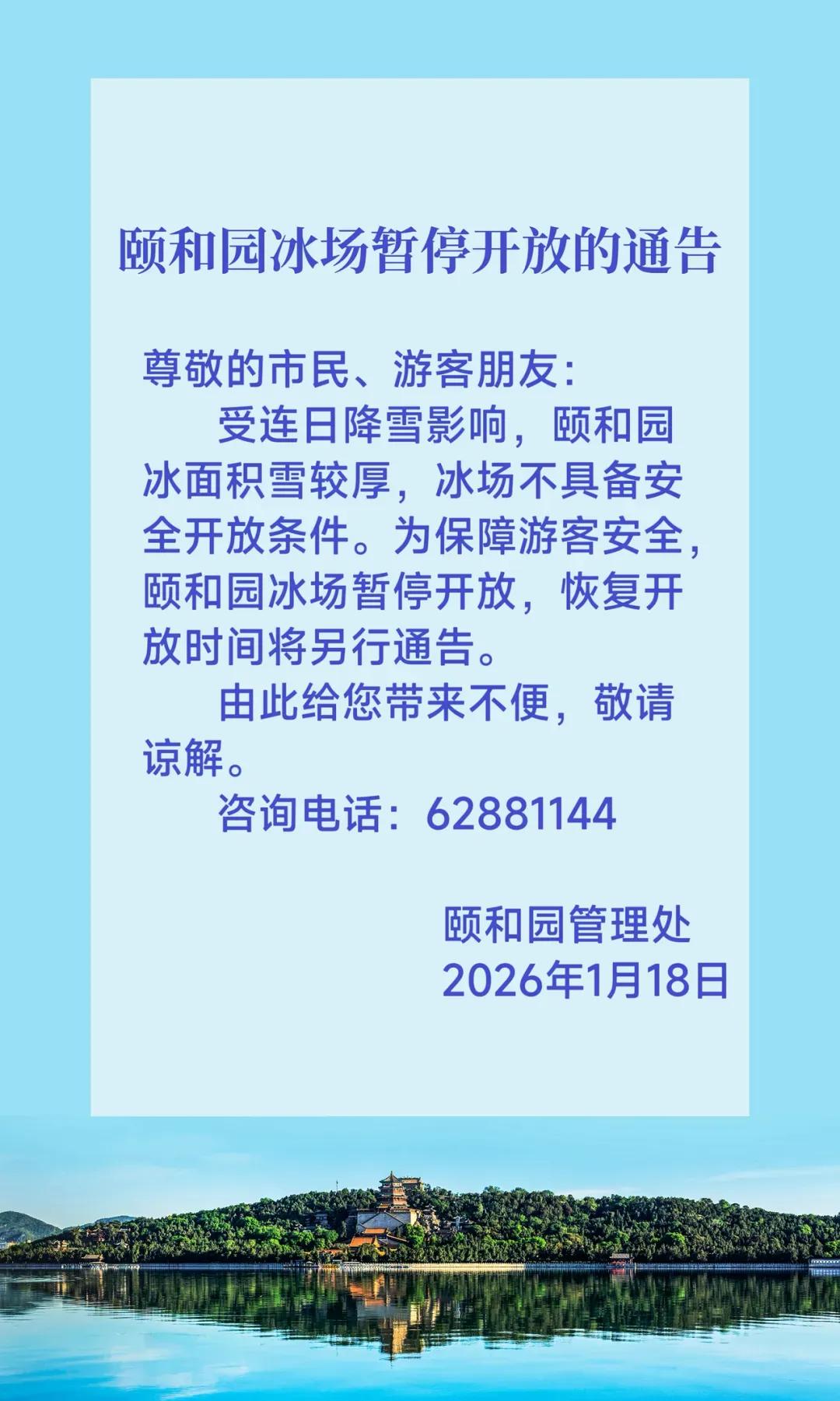 受连日降雪影响,冰场不具备安全开放条件,颐和园冰场暂停开放