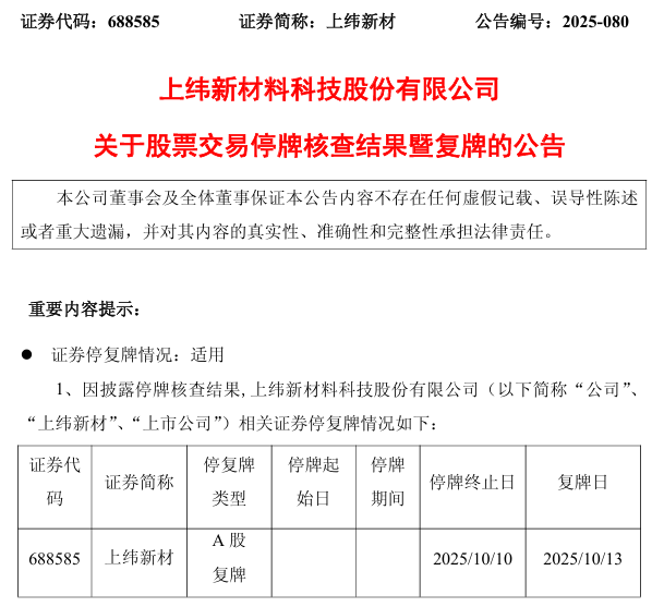 10月10日,上纬新材公告,公司就股票交易异常波动的相关事项进行了核查。鉴于相关核查工作已完 成,经公司向上交所申请,公司股票将于10月13日(星期一)开市起复牌。 | "上纬新材"、"上市公司")相关证券停复牌情况如下: | | --- | | 证券代 | 证券简称 | 停复牌 | 停牌起 | 停牌 | 停牌终止日 | 复牌日 | | --- | --- | --- | --- | --- | --- | --- | | 码 | | 类型 | 始日 | 期间 | | | | 688585 | 上纬新材 | A 股 | | | 2025/10/10 | 2025/10/13 | | | | 复牌 | | | | | 关于核查的结果,上纬新材公告,公司已关注到近期市场存在部分媒体关于上纬新材与实际控制人邓泰 华及其控制的智元创新(上海)科技有限公司相关资产进行整合的讨论与报道。公司发函向公司收购人 暨控股股东上海智元恒岳科技合伙企业(有限合伙)及实际控制人邓泰华核实,截至目前,收购方智元 恒岳及其一致行动人上海致远新创科技设备合伙企业(有限合伙)(简称"致远新创合伙")不存在在未 来12个月内对上市公司及其子公 ...