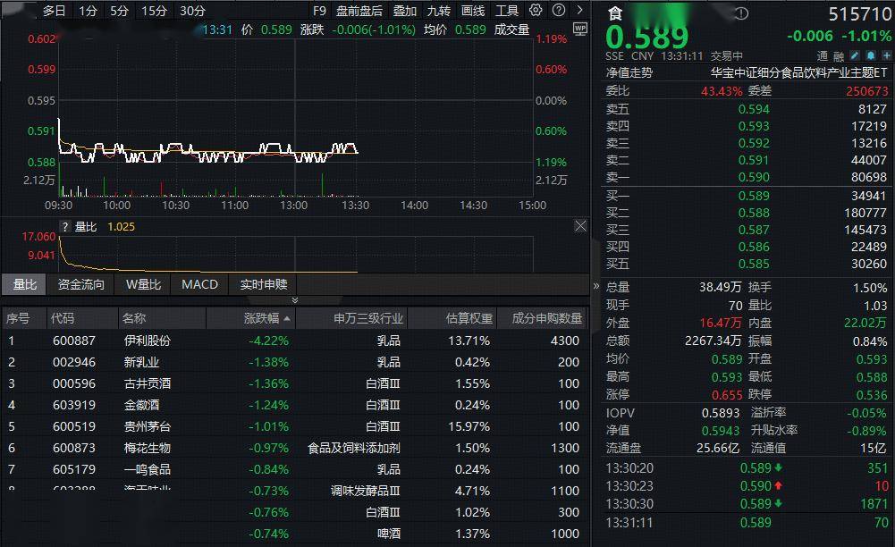吃喝板块今日(1月8日)又陷回调,反映吃喝板块整体走势的食品饮料ETF华宝(515710)开盘后持续 低位震荡,截至发稿,场内价格跌1.01%。 成份股方面,部分白酒龙头及乳制品企业跌幅居前,截至发稿,伊利股份大跌超4%,贵州茅台、古井 贡酒、金徽酒、新乳业等跌超1%,拖累板块走势。 | F9 盘前盘后 盛加 九转 画线 工具 (2 > | | 分时 多日 1分 5分 15分 30分 · | | | | | | | | 食品饮料ETF华宝 O | | 515710 | | --- | --- | --- | --- | --- | --- | --- | --- | --- | --- | --- | --- | --- | | 515710[食品饮料ETF华富] 13:31 价 0.589 温康 -0.006(-1.01%) 均价 0.589 服交量 | 0.602 | | | | | | | | E 1.1999 | 0.589 | | -0.006 -1.01% | | 通用不断用 | | | | | | | | | | SSE CNY 13:31:11 交易中 | | | | 0.599 | | | ...