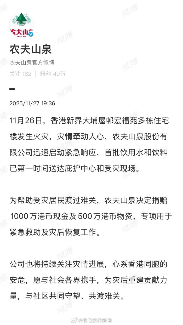 Core Viewpoint - The company, Nongfu Spring, has announced a donation of 10 million HKD in cash and 5 million HKD in supplies for emergency relief and post-disaster recovery efforts following a fire incident in Hong Kong [1] Group 1 - On November 26, a fire occurred in multiple residential buildings at Hong Kong's Tai Po Wu Kwan, causing significant concern [1] - Nongfu Spring quickly activated an emergency response, delivering the first batch of drinking water and beverages to shelters and the disaster site [1]